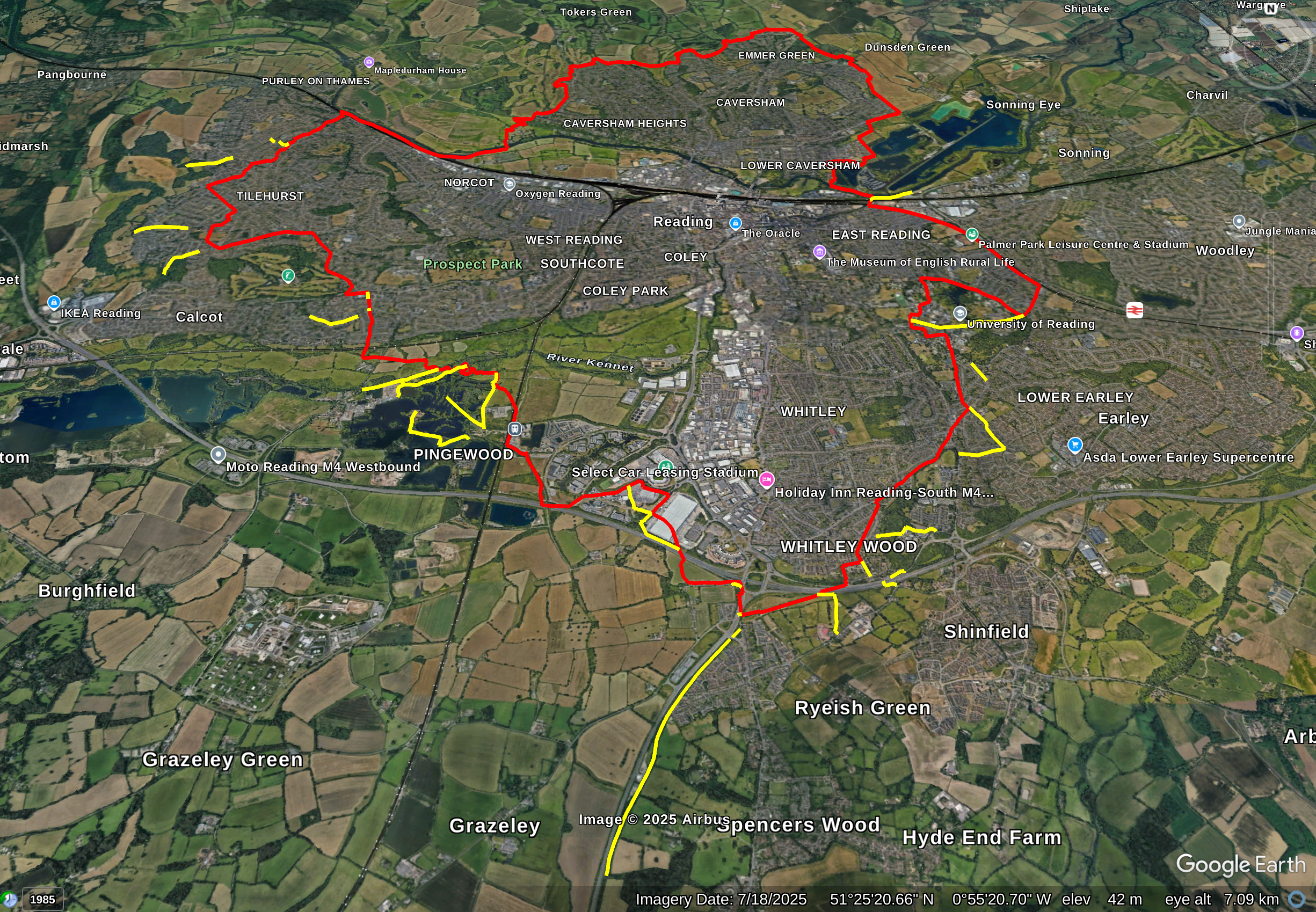 The council of Reading have provided me with a gpkg file that has the details of their public rights of way. The gpkg file seems to have been created on 30th January 2025. In October 2025, BC reported to me that the council's data has public rights of way that are outside Reading. On investigating, I found that there were 39 public rights of way that are outside Reading. In the council's data, these public rights of way have a PAR_NAME that is not READING. Here is a list of PAR_NAMEs that are used together with the number of paths that have that PAR_NAME: BURGHFIELD 10, EARLEY 5, SHINFIELD 13, THEALE 4 and TILEHURST 7. This screenshot shows GoogleEarth with the boundary of Reading (in red) and the paths (in yellow) that have a PAR_NAME that is not READING. My thanks to the Ordnance Survey as the boundary for Reading has been produced using their Boundary-Line product. The Council also provides information about public rights of way in some maps that are on this web page. It may be that their maps use more up-to-date information. An authority's Definitive Map is the authoritative source of their rights of way. The details of the public rights of way network contained in an authority's data are for information only, and are an interpretation of the Definitive Map, not the Definitive Map itself, and should not be relied on for determining the position or alignment of any public right of way. For legal purposes, an authority's data does not replace their Definitive Map. And changes may have been made to the Definitive Map that are not included in their data. The authority's data contains Ordnance Survey data © Crown copyright and database right 2026. Attempting to view this data with more detail than 1:10000 may produce an inaccurate rendering of the route of a public right of way.